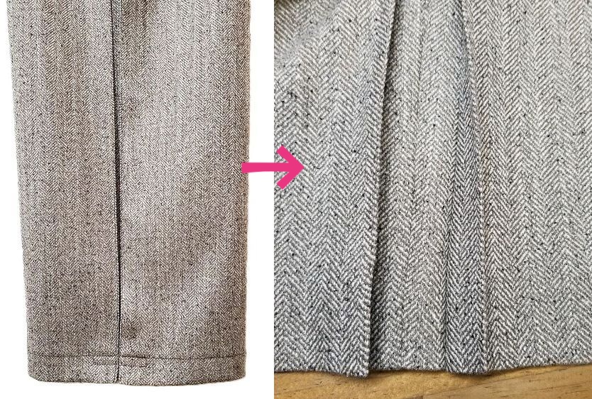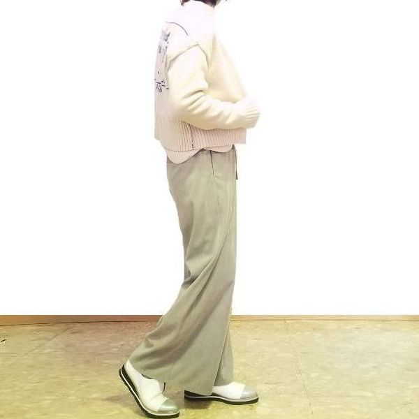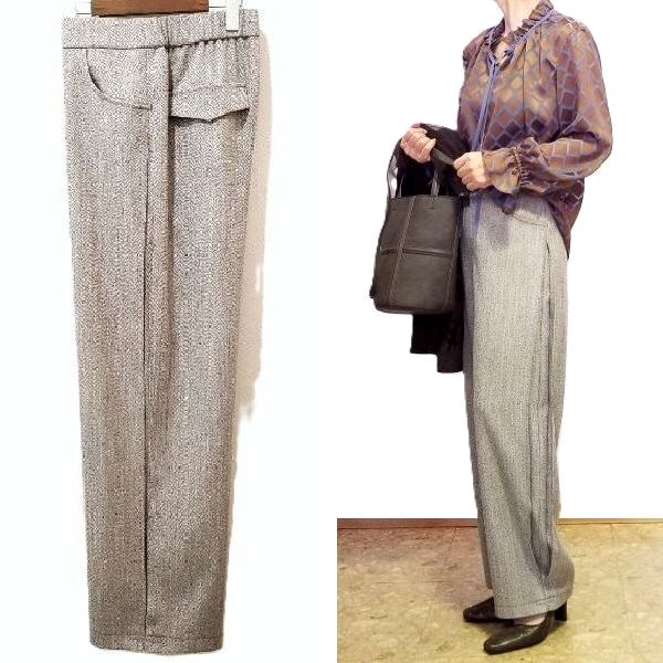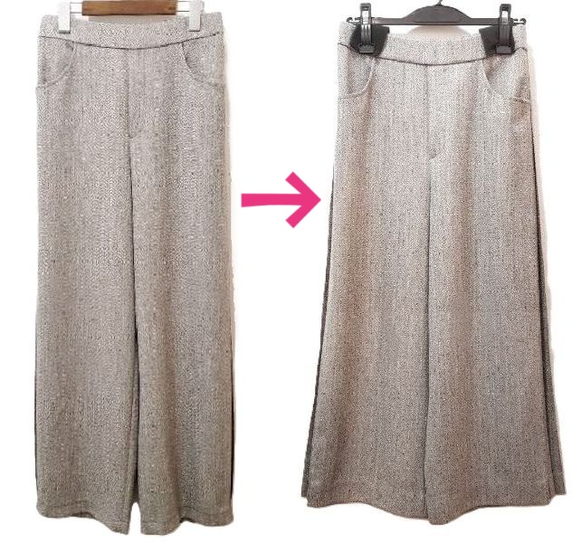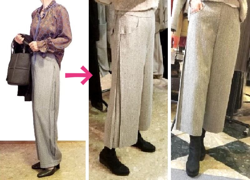 ☆今日の50代からのコーディネートのコーナーは、小柄なお客様に合わせて、ウーリーツイードのワイドパンツをクロップドワイドにシルエット変更しましたので、そちらのリメイクのビフォーアフターをご紹介させて頂きます。