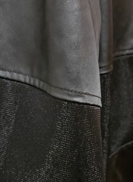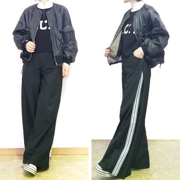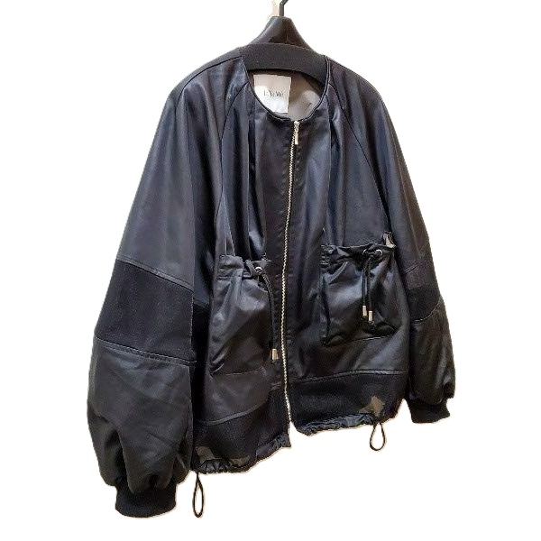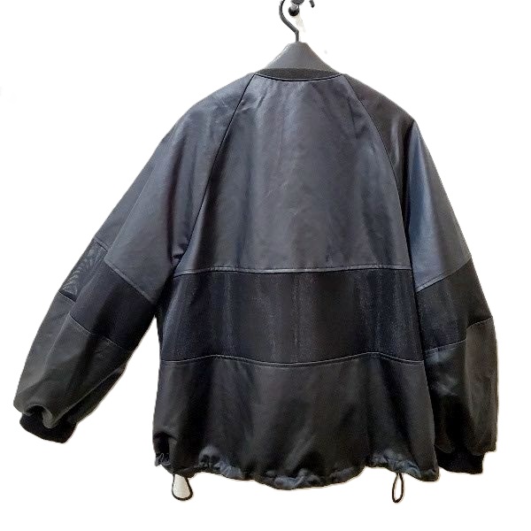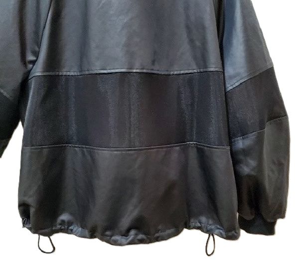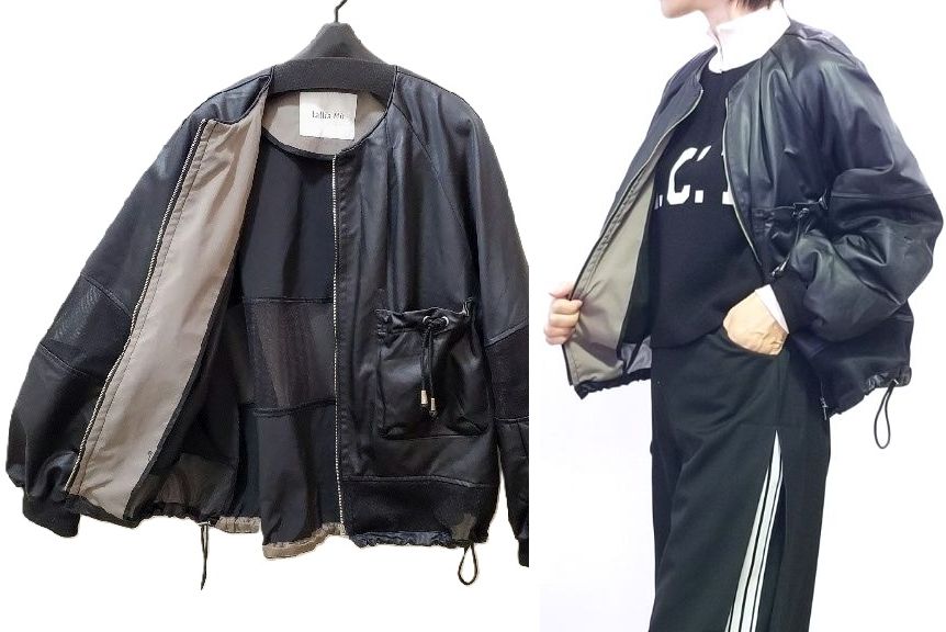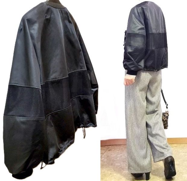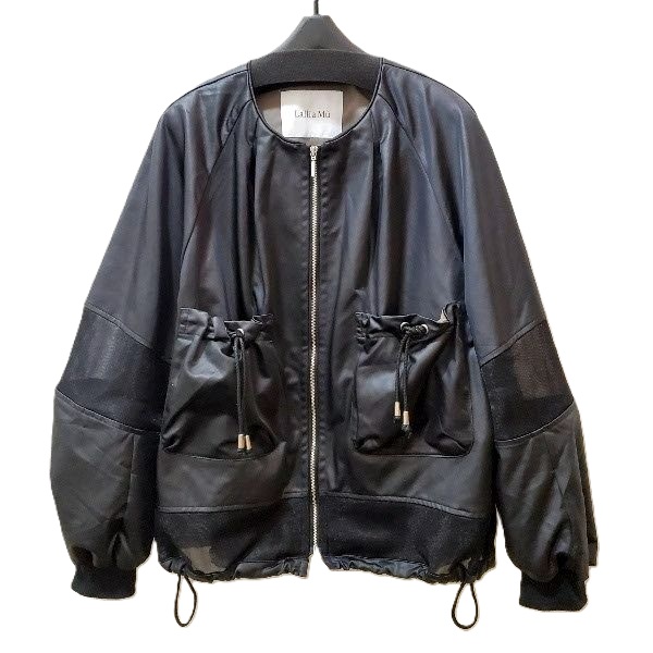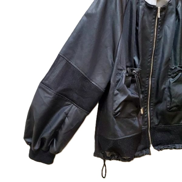 光沢のあるレザーライクサテンにシアーな素材の切替えと、大きめポケットが映えるノーカラーブルゾンです。