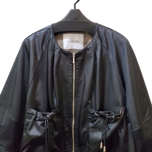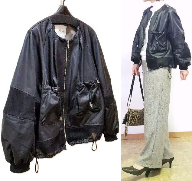 本日は、レザーライクサテンのノーカラーブルゾンをご紹介させて頂きます。