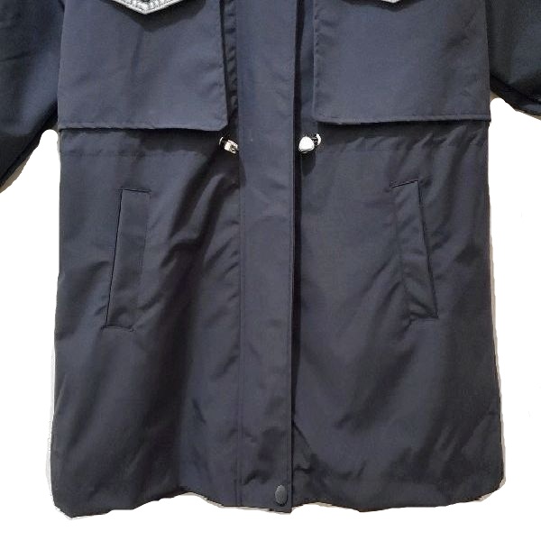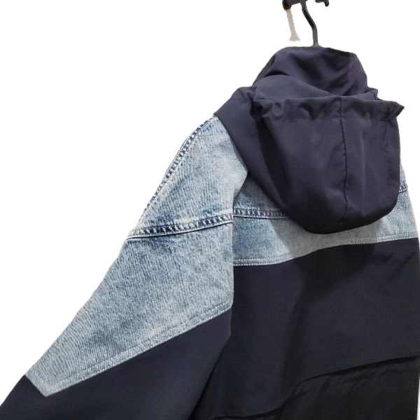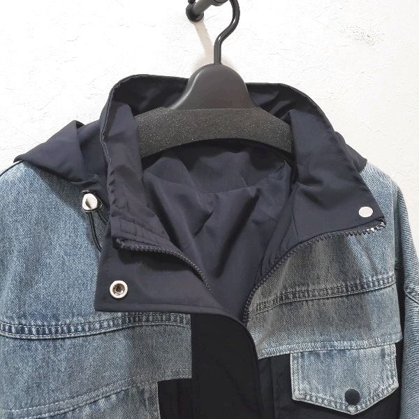 ポリエステルベースの軽やかな着心地に、デニム切替えがアクセントになった、フード付きのハーフコートです。