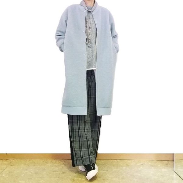 ロングニットは細身パンツで締めるか
