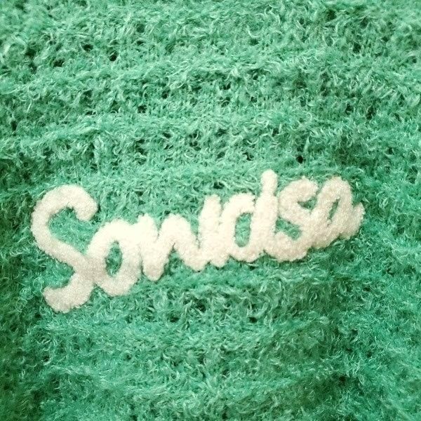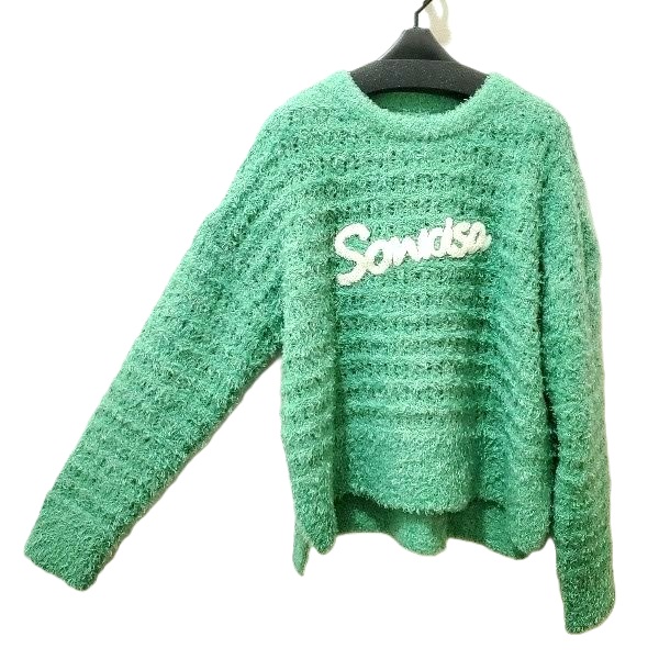 ポコポコとしたロゴがふんわりニットにちょこんと乗ってます