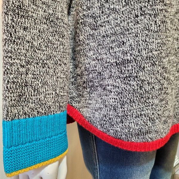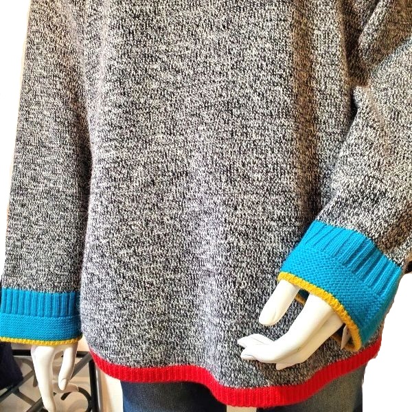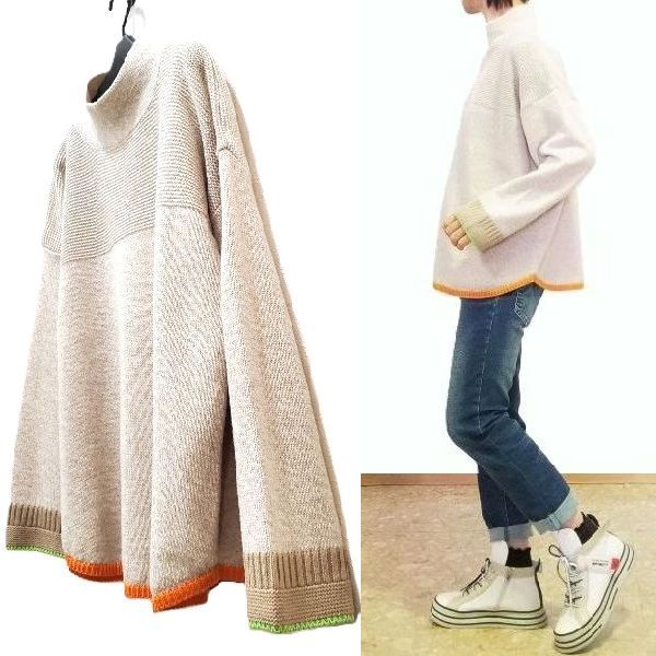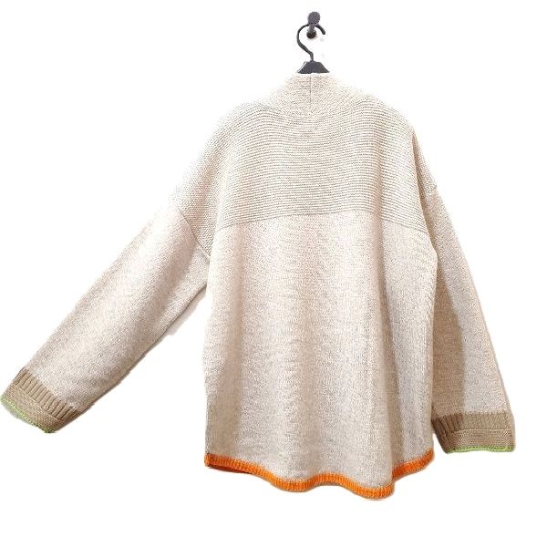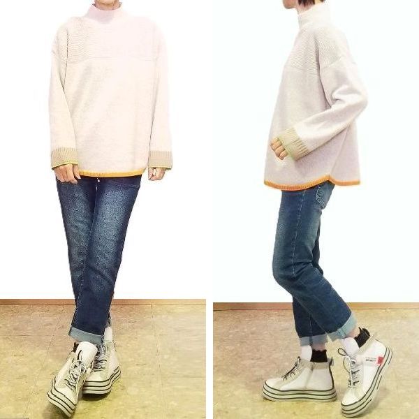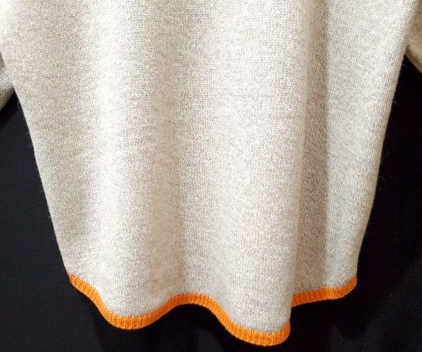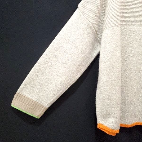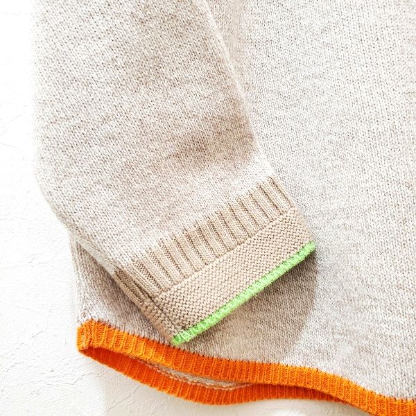 袖口に黄緑、裾にオレンジ色の配色ラインが入った、春待ち色のアンゴラ混プルオーバーです。