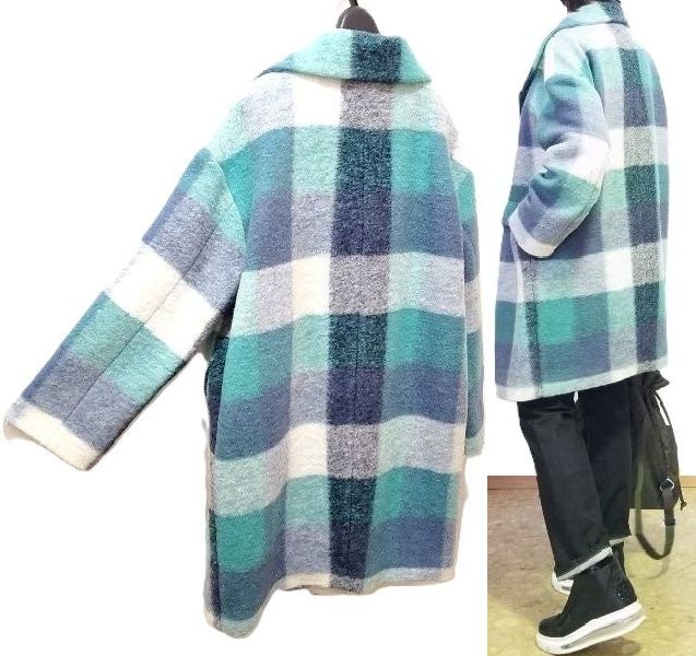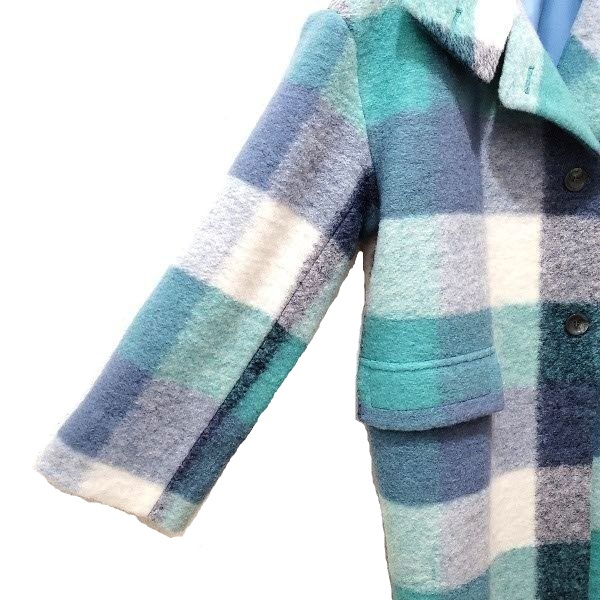 お洒落なブルーのコントラストが爽やかな、大柄チェックのセミロングコートです。