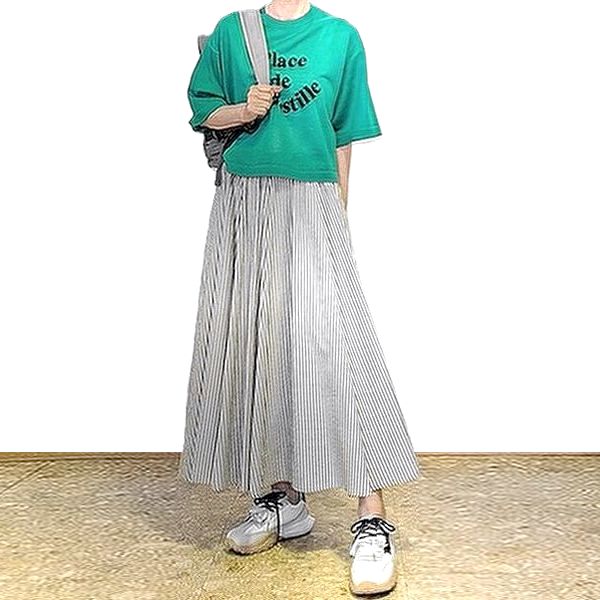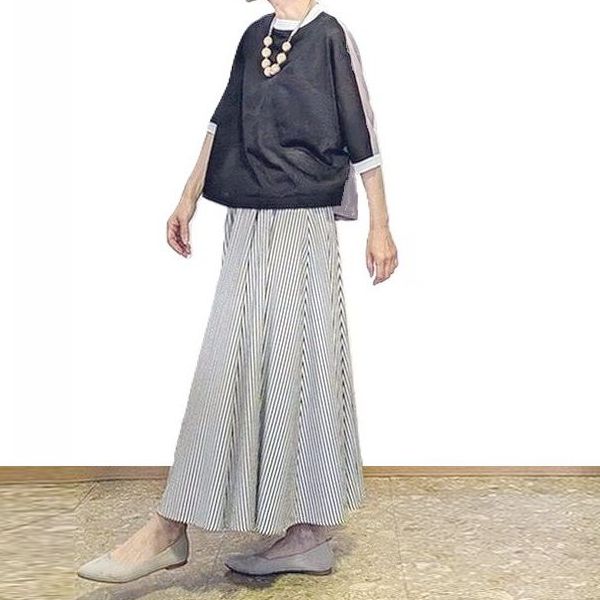 接ぎ合せたストライプの微妙な陰影が大人な、縦長効果もバッチリのフレアースカートです。