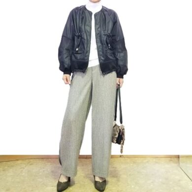 抜け感が可愛い大人のレザーライクサテンのノーカラーブルゾン & 50代からのコーデ