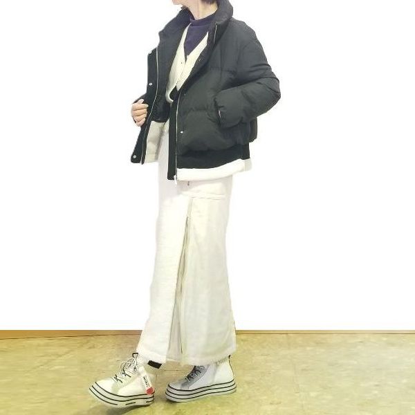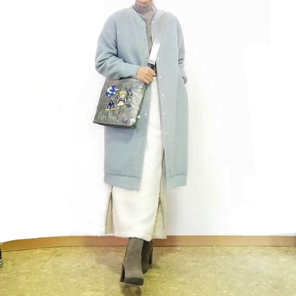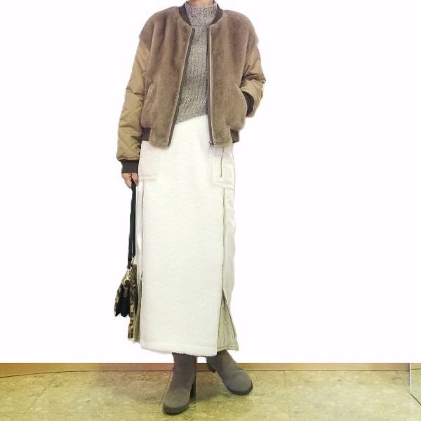 冬コーデを明るく更新♪オフホワイトのボア切替えロングスカート&50代からのコーデ