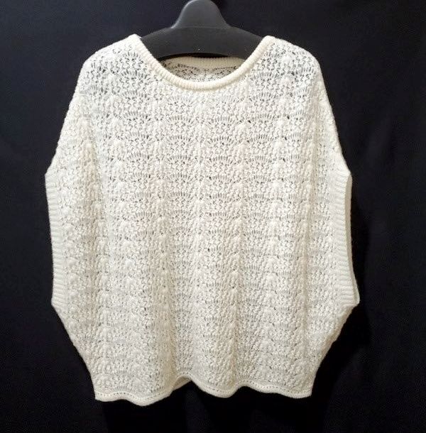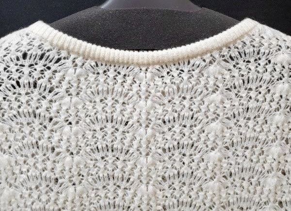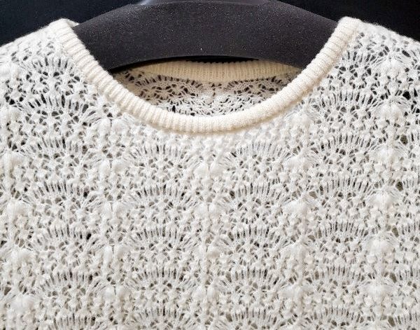 大きく開いた袖口は表編み裏編みが2段毎段々になった