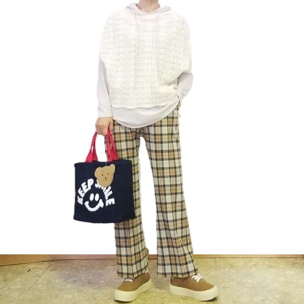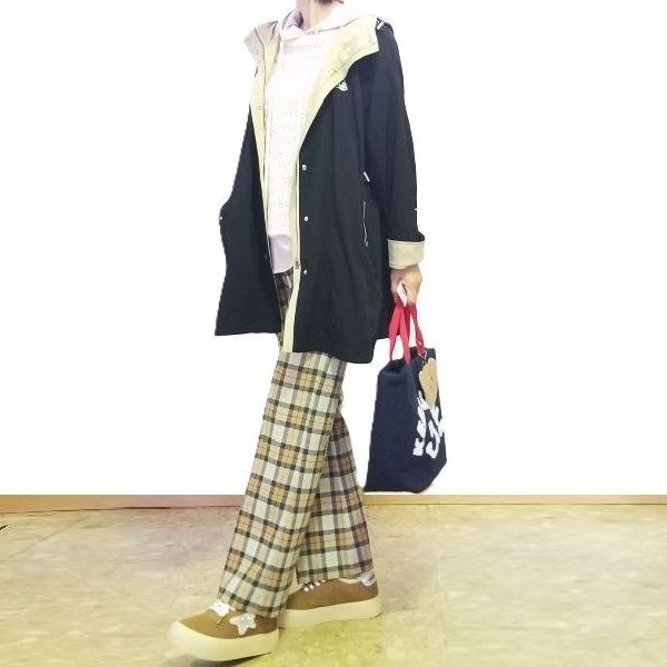 フード、チェック柄、ロゴ、🐻、☆、厚底ソール