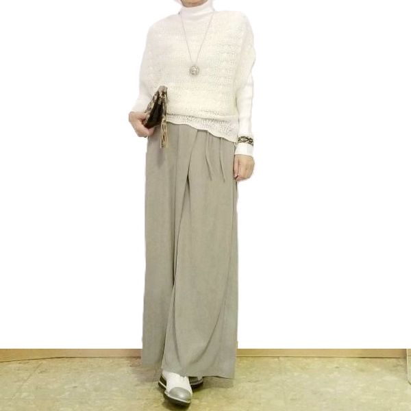 ドロップショルダーのニットベスト 今日はオフホワイトです & 50代からの旅行用コーデ初日